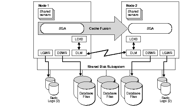 As Figure 12-1 illustrates, Cache Fusion enables the buffer cache of one node to send data blocks directly to the buffer cache of another node by way of low latency, high bandwidth interconnects. This reduces the need for expensive disk I/O in parallel cache management.