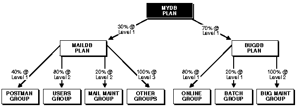 If these plan directives were in effect and there were an infinite number of runnable sessions in all consumer groups, then the MAILDB plan would be assigned 30% of the available CPU resources, while the BUGDB plan would be assigned 70% of the available CPU resources. Breaking this further down, sessions in the "Postman" consumer group would be run 12% (40% of 30%) of the time, while sessions in the "Online" consumer group would be run 56% (80% of 70%) of the time. The following diagram depicts this scenario: