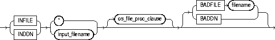 To specify a file that contains the data to be loaded, use the INFILE keyword, followed by the filename and optional processing options string. Remember that a filename specified on the command line overrides the first INFILE keyword in the control file. If no filename is specified, the filename defaults to the control filename with an extension or file type of DAT.