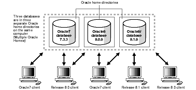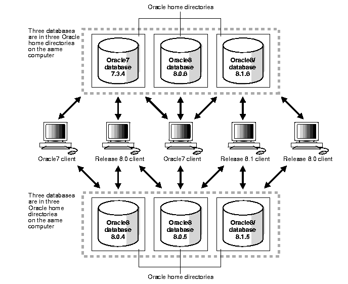 You can install version 7 and version 8 databases in multiple (separate) Oracle homes and have both version 7 and version 8 clients connecting to version 7 and version 8 databases. Figure 1-2 shows an example of this network configuration: