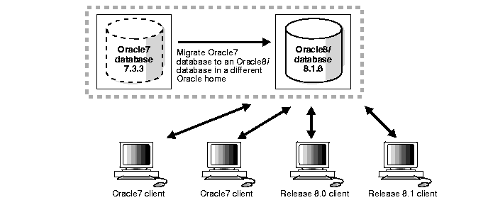 You can migrate your version 7 database to a version 8 database and have both version 7 and version 8 clients connecting to the version 8 database. You cannot migrate your version 7 database to a version 8 database in the same Oracle home.