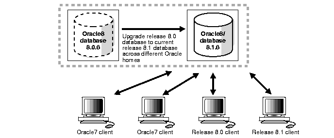You can upgrade your release 8.0 database, for example release 8.0.6, to release 8.1 and have both version 7 and release 8.0 clients connecting to the release 8.1 database. You cannot upgrade your release 8.0 database to a release 8.1 database in the same Oracle home.