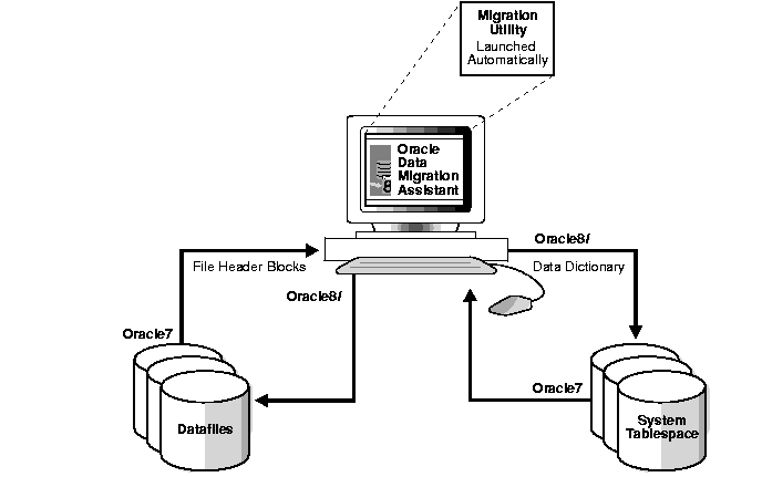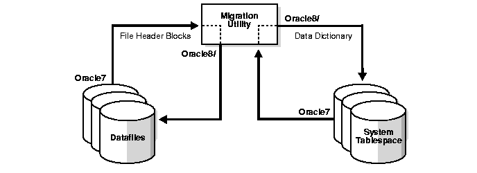 The Migration utility is a command-line utility for migration of a complete database from Oracle7 to Oracle8i. It changes datafile headers but leaves actual data unchanged. It does not copy data.