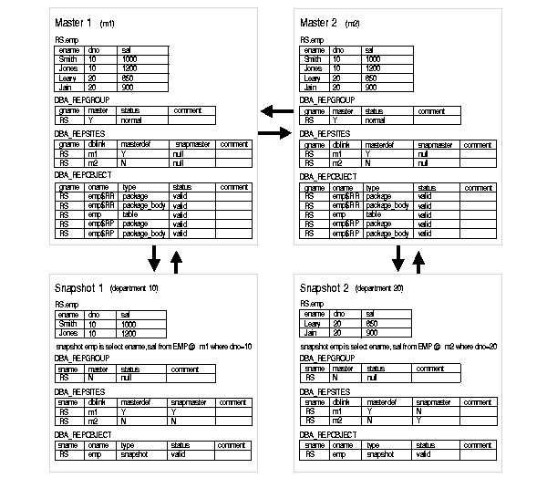 When you install replication capabilities at a site, Oracle installs the replication catalog, which consists of tables and views, at that site. As shown in Figure 9-1, the views are used by master and snapshot sites to determine such information as what objects are being replicated, where they are being replicated, and if any errors have occurred during replication.