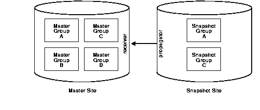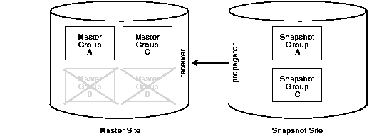 Untrusted security assigns only the privileges to the proxy snapshot administrator and receiver that are required to work with specified master groups. The propagator and snapshot administrator, therefore, can only access these specified master groups at the Master Site. Figure A-4 illustrates an untrusted security model with snapshot replication. Because the Snapshot Site contains Snapshot Groups A and C, access to only Master Groups A and C are required. Using untrusted security does not allow the propagator or the snapshot administrator at the Snapshot Site to access Master Groups B and D at the Master Site.