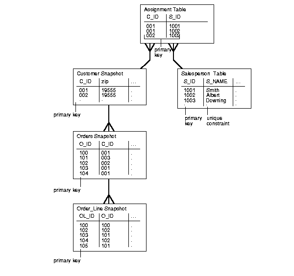 With this flexibility, managers can easily control snapshot data sets by making simple changes to the assignment table, without requiring you to modify any SQL. For example, if the specified salesperson was assigned two new customers, the manager would simply assign these two new customers to the salesperson in the assignment table. After the next snapshot refresh, the data for these two customers is propagated to the target snapshot site, such as the salesperson's laptop. Conversely, if a customer was taken away from the specified salesperson, all data pertaining to the specified customer is removed from the snapshot site after the next refresh and the salesperson can no longer access that information.