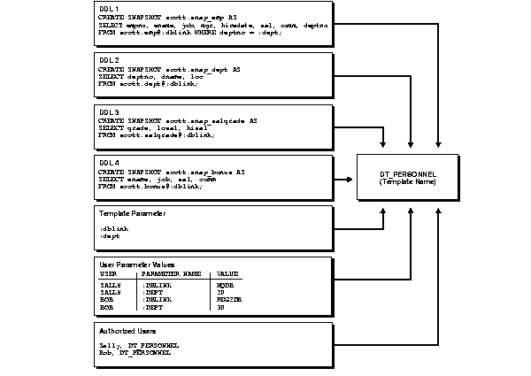 DECLARE a NUMBER; BEGIN a := DBMS_REPCAT_RGT.CREATE_TEMPLATE_OBJECT( refresh_template_name => 'dt_snapenv', object_name => 'foo_snap', object_type => 'snapshot', ddl_text => 'CREATE SNAPSHOT foo_snap AS SELECT empid, region, dept, salary FROM scott.foo@hq.com'); END; /