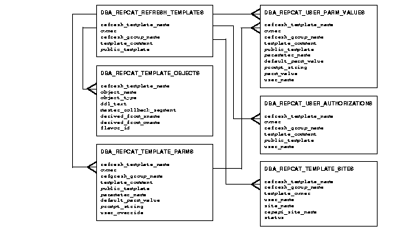 Oracle deployment templates center around the general template information, which consists of the template name, target refresh group, and private/public status. As illustrated in Figure 4-1, the REFRESH_TEMPLATE_NAME is used in all aspects of deployment template data dictionary views. You add the snapshot environment objects to the template prior to releasing the template for distribution according to the specified template identification (see Figure 4-2).