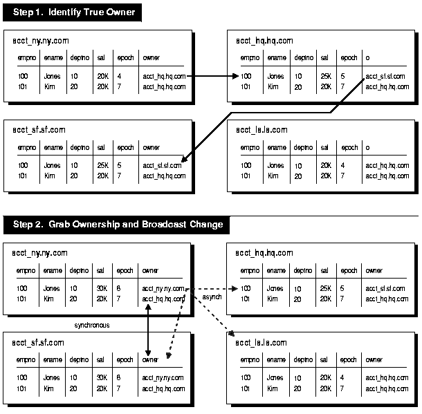 For example, Figure 6-3 illustrates how ownership of employee 100 passes from the ACCT_SF database to the ACCT_NY database.