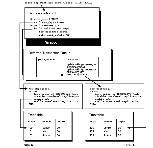 The wrapper package has the same name as the original package, but its name is prefixed with the string you supply when you generate replication support for the procedure. If you do not supply a prefix, Oracle uses the default prefix, "defer_". The wrapper procedure has the same parameters as the original, along with two additional parameters: CALL_LOCAL and CALL_REMOTE. These two boolean parameters determine where the procedure gets executed. When CALL_LOCAL is TRUE, the procedure is executed locally. When CALL_REMOTE is TRUE, the procedure will ultimately be executed at all other master sites in the replicated environment.