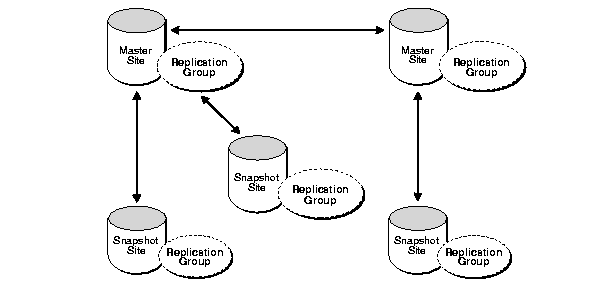 A replication group can exist at multiple replication sites. Replication environments support two basic types of sites: master sites and snapshot sites. One site can be both a master site and a snapshot site at the same time.