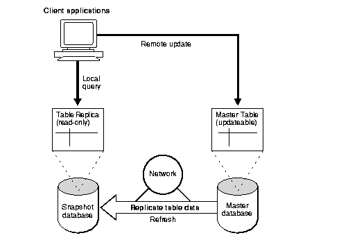 In a basic configuration, snapshots can provide read-only access to the table data that originates from a master site. Applications can query data from read-only snapshots to avoid network access regardless of network availability. However, applications throughout the system must access data at the master site to perform an update. Figure 1-2 illustrates basic, read-only replication. The master tables of read-only snapshots do not need to belong to a master group.