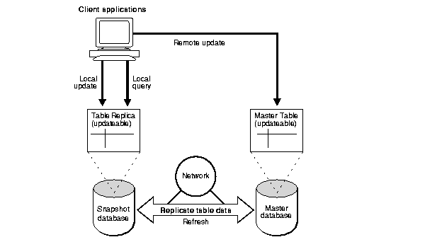 In a more advanced configuration, you can create an updateable snapshot that allows users to insert, update, and delete rows of the target master table by performing these operations on the snapshot. An updateable snapshot may also contain only a subset of the data in the target master table. Figure 1-3 illustrates a replication environment using updateable snapshots.