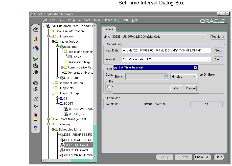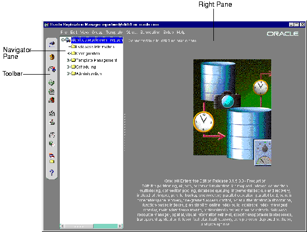 Oracle Replication Manager provides a graphical user interface (GUI) for setting up, managing, and monitoring a replication environment. Replication Manager includes wizards that guide you through many important operations. You can use Replication Manager to manage both multimaster and snapshot replication environments. Replication Manager is integrated with Oracle Enterprise Manager.