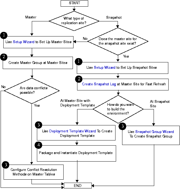 The flowchart in Figure 8-11 displays the major decisions and tasks that are involved when you create a replication environment using Replication Manager. The flowchart shows the major decisions and steps for building both multimaster and snapshot environments. Each task in the flowchart includes a cross reference to a section in this book that provides more information about the task. Detailed instructions about for completing these tasks are in the Replication Manager online help.