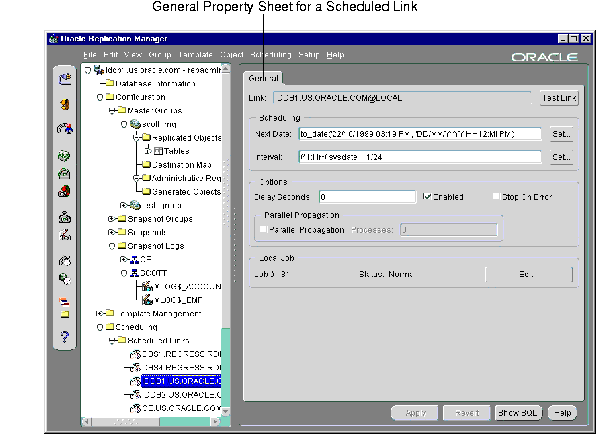 The right pane of replication manager contains both information that enables you to monitor your replication environment and property sheets that enable you to manage your replication environment. Figure 8-2 shows an example of a property sheet.