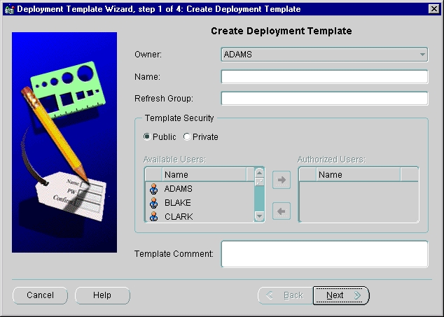 The Deployment Template Wizard guides you through creating a deployment template. Separate screens in the Deployment Template Wizard let you: