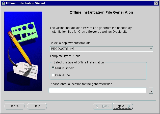 Opens the Offline Instantiation Wizard, which guides you through the process of packaging the deployment template and generating offline instantiation files. You can generate offline instantiation files for Oracle8i Lite and for Oracle server (which includes Oracle8i Enterprise Edition, Oracle8i Standard Edition, and Oracle8i Personal Edition). When you generate offline instantiation files, make sure you are connected to the master site that contains the deployment template.
