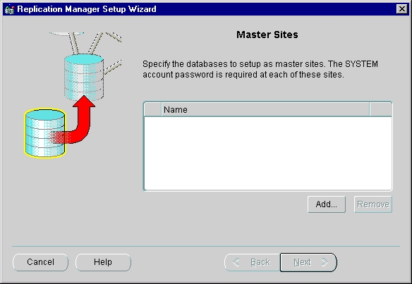 Opens the Replication Manager Setup Wizard, which guides you through the process of setting up master sites and snapshot sites. When you run the Replication Manager Setup Wizard, make sure you are connected as SYS or SYSTEM user.