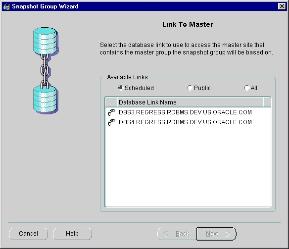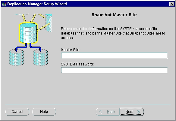 The Snapshot Group Wizard guides you through creating a group of snapshots based on a master group. Each snapshot can be a partial or complete copy of the master table from its source master group. Snapshot groups are located at remote snapshot sites and are based on a single, target master group at a master site.