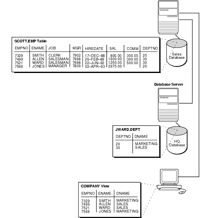 CREATE VIEW company AS SELECT a.empno, a.ename, b.dname FROM emp a, dept@hq.acme.com b WHERE a.deptno = b.deptno;