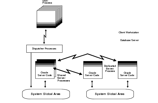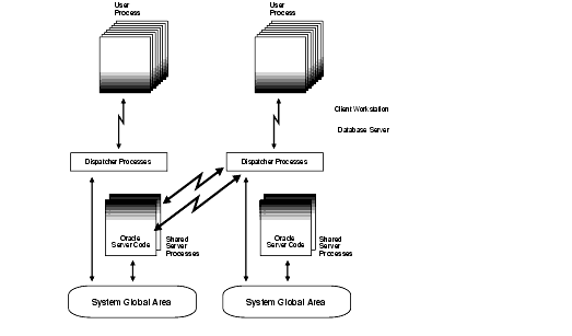 In the configuration illustrated in Figure 2-1, a shared server process in the local server owns a dedicated remote server process. The advantage is that a direct network transport exists between the local shared server and the remote dedicated server. A disadvantage is that extra back-end server processes are needed.