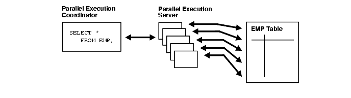 Figure 23-2 illustrates several parallel execution servers simultaneously performing a partial scan of the EMP table, which is divided by block range dynamically (dynamic partitioning). The parallel execution servers send results back to the parallel execution coordinator, which assembles the pieces into the desired full table scan.