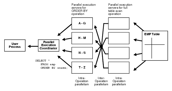 Also note that all of the parallel execution servers involved in the scan operation send rows to the appropriate parallel execution server performing the sort operation. If a row scanned by a parallel execution server contains a value for the ENAME column between A and G, that row gets sent to the first ORDER BY parallel execution server. When the scan operation is complete, the sorting processes can return the sorted results to the coordinator, which in turn returns the complete query results to the user.