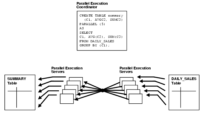 Parallel execution performs these operations in parallel using multiple parallel processes. One process, known as the parallel execution coordinator, dispatches the execution of a statement to several parallel execution servers and coordinates the results from all of the server processes to send the results back to the user.