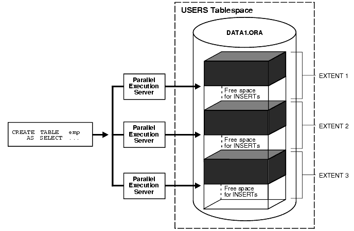 When you create indexes and tables in parallel, each parallel execution server allocates a new extent and fills the extent with the table or index's data. Thus, if you create an index with a degree of parallelism of 3, there will be at least three extents for that index initially. This discussion also applies to rebuilding indexes in parallel and moving, splitting, or rebuilding partitions in parallel.