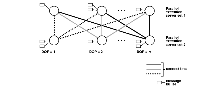 When a connection is between two processes on the same instance, the servers communicate by passing the buffers back and forth. When the connection is between processes in different instances, the messages are sent using external high-speed network protocols. In Figure 23-3, the degree of parallelism is equal to the number of parallel execution servers, which in this case is "n". Figure 23-3 does not show the parallel execution coordinator: each parallel execution server actually has an additional connection to the parallel execution coordinator.