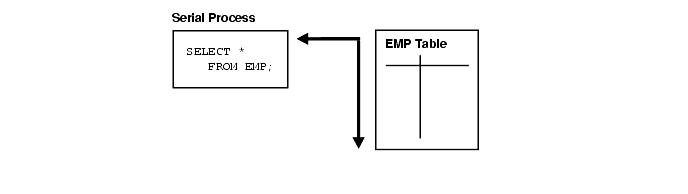 When parallel execution is not being used, a single server process performs all necessary processing for the sequential execution of a SQL statement. For example, to perform a full table scan (such as SELECT * FROM EMP), one process performs the entire operation, as illustrated in Figure 23-1.