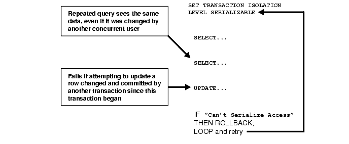 Figure 24-2 shows an example of an application that rolls back and retries the transaction after it fails with the "Cannot serialize access" error: