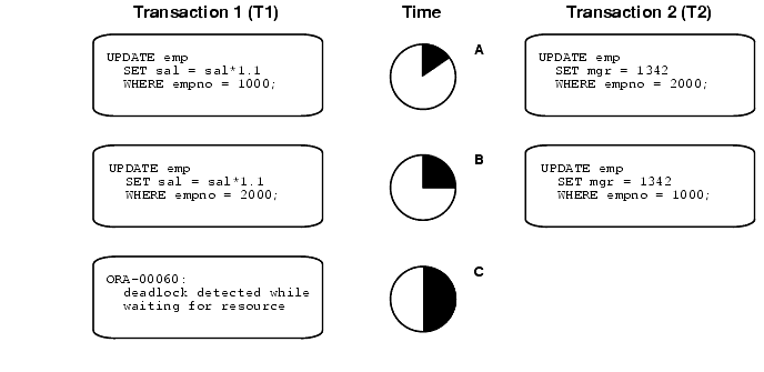 In Figure 24-3, no problem exists at time point A, as each transaction has a row lock on the row it attempts to update. Each transaction proceeds without being terminated. However, each tries next to update the row currently held by the other transaction. Therefore, a deadlock results at time point B, because neither transaction can obtain the resource it needs to proceed or terminate. It is a deadlock because no matter how long each transaction waits, the conflicting locks are held.