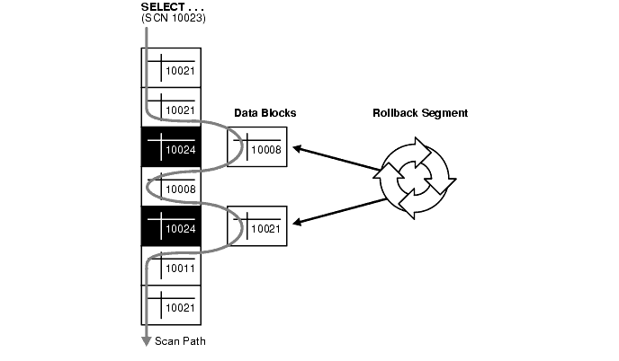 As a query enters the execution stage, the current system change number (SCN) is determined; in Figure 24-1, this system change number is 10023. As data blocks are read on behalf of the query, only blocks written with the observed SCN are used. Blocks with changed data (more recent SCNs) are reconstructed from data in the rollback segments, and the reconstructed data is returned for the query. Therefore, each query returns all committed data with respect to the SCN recorded at the time that query execution began. Changes of other transactions that occur during a query's execution are not observed, guaranteeing that consistent data is returned for each query.