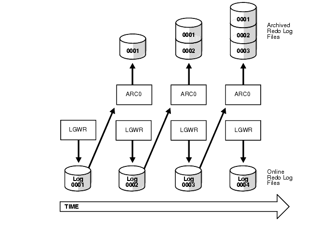 Optionally, you can configure an Oracle database to archive files of the online redo log once they fill. The online redo log files that are archived are uniquely identified by their log sequence numbers and make up the archived redo log. By archiving filled online redo log files, older redo log information is preserved for operations such as media recovery, while the pre-allocated online redo log files continue to be reused to store the most current database changes.