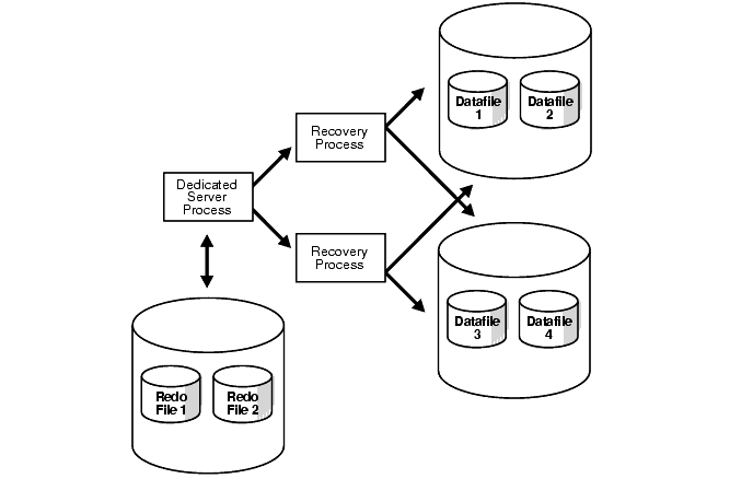 In a typical parallel recovery situation, one process is responsible for reading and dispatching redo entries from the redo log files. This is the dedicated server process that begins the recovery session. The server process reading the redo log files enlists two or more recovery processes to apply the changes from the redo entries to the datafiles.