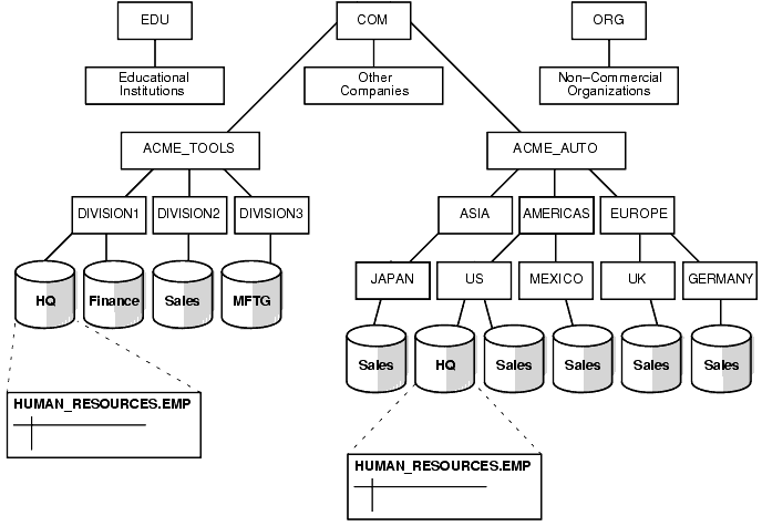 The name of a database is formed by starting at the leaf of the tree and following a path to the root. For example, the MFTG database is in DIVISION3 of the ACME_TOOLS branch of the COM domain. The global database name for MFTG is created by concatenating the nodes in the tree as follows: