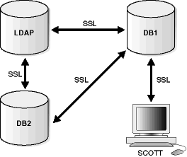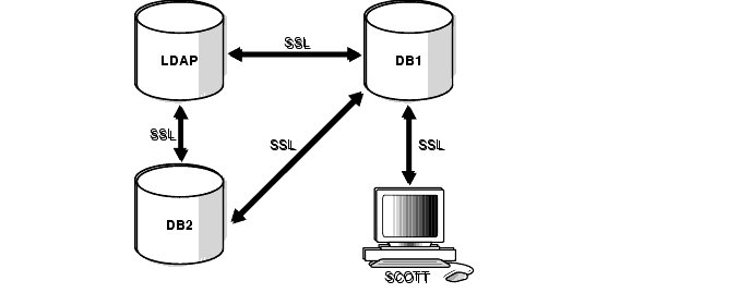 The user invoking the CURRENT_USER link does not have to be a global user. For example, if JANE is authenticated by password to the Accounts Payable database, she can access a stored procedure to retrieve data from the HR database. The procedure uses a current user database link, which connects her to HR as global user SCOTT. SCOTT is a global user and thereby authenticated through a certificate and private key over SSL, but JANE is not.