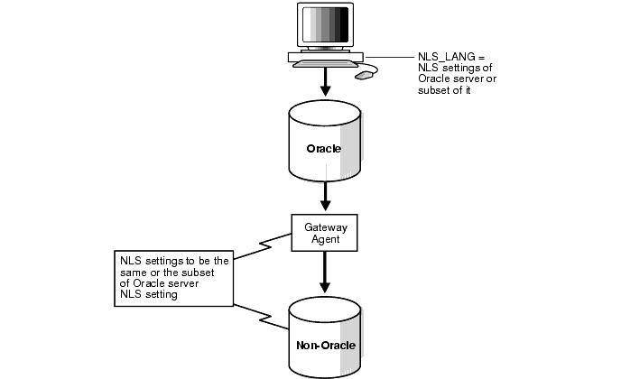 In a heterogeneous environment, the NLS settings of the client, the transparent gateway and the non-Oracle data source, should be either the same or a subset of the Oracle server NLS character set as illustrated in Figure 30-8. Transparent gateways have full NLS support.