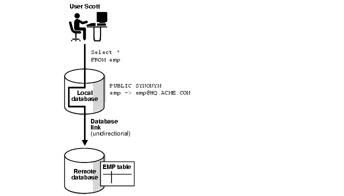 Figure 30-3 shows an example of user SCOTT accessing the EMP table on the remote database with the global name HQ.ACME.COM: