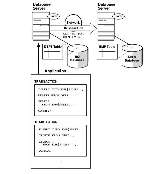 In Figure 30-2, the host for the HQ database is acting as a database server when a statement is issued against its local data (for example, the second statement in each transaction issues a statement against the local DEPT table), but is acting as a client when it issues a statement against remote data (for example, the first statement in each transaction is issued against the remote table EMP in the SALES database).