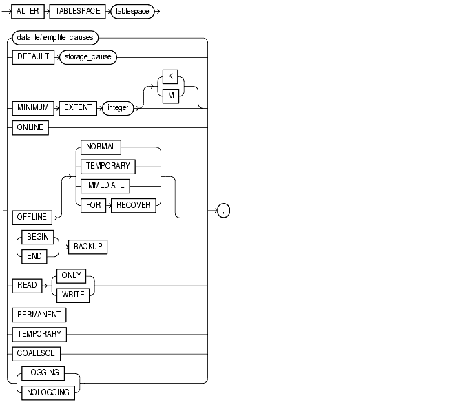 If you have ALTER TABLESPACE system privilege, you can perform any of this statement's operations. If you have MANAGE TABLESPACE system privilege, you can only perform the following operations:
