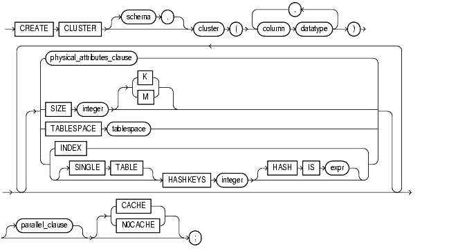 is the schema to contain the cluster. If you omit schema, Oracle creates the cluster in your current schema. |