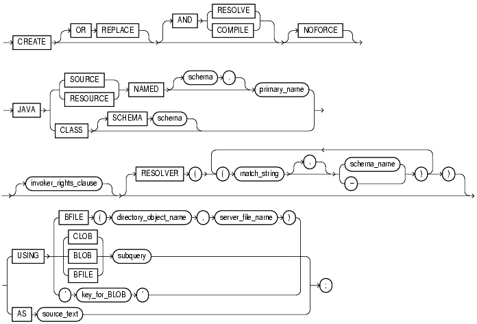 To create or replace a schema object containing a Java source, class, or resource in your own schema, you must have CREATE PROCEDURE system privilege. To create such a schema object in another user's schema, you must have CREATE ANY PROCEDURE system privilege. To replace such a schema object in another user's schema, you must also have ALTER ANY PROCEDURE system privilege.