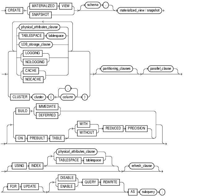 To create a materialized view. The terms snapshot and materialized view are synonymous in Oracle documentation. This reference uses "materialized view" for consistency. Both refer to a database object that contains the results of a query of one or more tables.