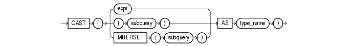 CAST allows you to convert built-in datatypes or collection-typed values of one type into another built-in datatype or collection type. You can cast an unnamed operand (such as a date or the result set of a subquery) or a named collection (such as a varray or a nested table) into a type-compatible datatype or named collection. The type_name must be the name of a built-in datatype or collection type and the operand must be a built-in datatype or must evaluate to a collection value.