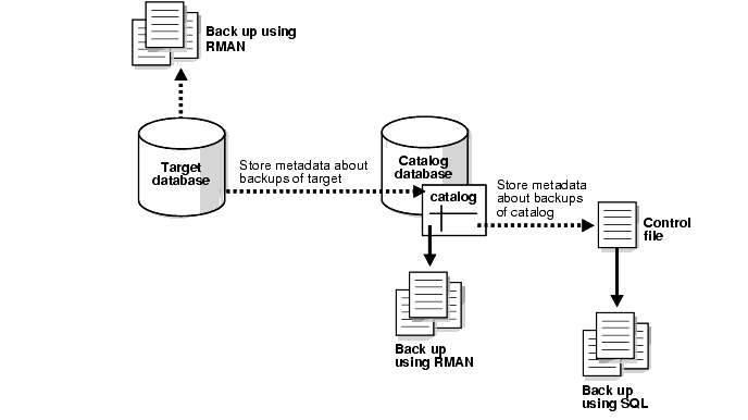 This rule is especially important when you want to back up a recovery catalog database. Take a case in which database RCAT contains the recovery catalog repository for target database PROD1. You decide to use a recovery catalog to back up RCAT, but are not sure where to store this catalog. If you store the catalog containing the repository for RCAT in database RCAT itself, then if you lose RCAT because of a media failure you will have difficulty restoring RCAT and will leave PROD1 unprotected.