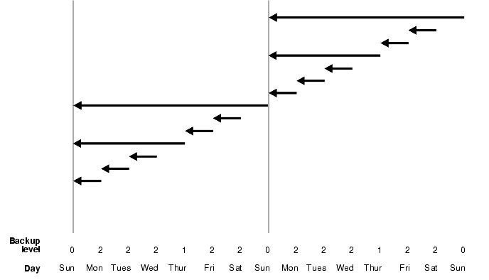 A differential incremental level 2 backup backs up all blocks that have changed since the most recent incremental backup at level n or less; in this case, the most recent incremental backup at level 2 or less is the level 0 Sunday backup, so only the blocks changed since Sunday will be backed up.