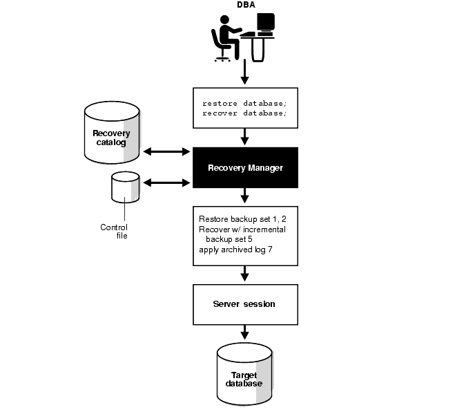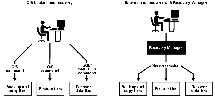 RMAN users server sessions to automate many of the backup and recovery tasks that were formerly performed manually. For example, instead of requiring you to locate appropriate backups for each datafile, copy them to the correct place using operating system commands, and choose which archived logs to apply, RMAN manages these tasks automatically.